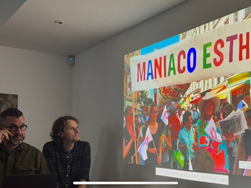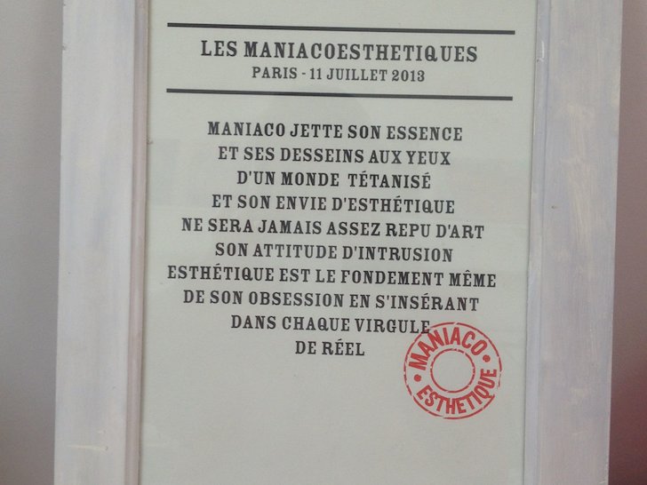 Les Maniaco-Esthétiques sont un duo artistique fondé en 2013 par Eugénie Bachelot-Prévert et Jérôme Barbe Fontaine, dont le rire a débuté aux Beaux-Arts de Paris en 1996. Leur manifeste prône un art compulsif dans chaque seconde du réel sous forme de performances utilisant l’humour, la dérision ou l’hommage à des moments clefs de notre vie et de notre histoire pour retrouver la spontanéité d’un art cousin de dada et des surréalistes. Leur économie de moyens affirme une forme de radicalité libératrice. Ils invitent volontiers d’autres artistes à participer aux performances, comme le public, dans une forme de joyeuse générosité.